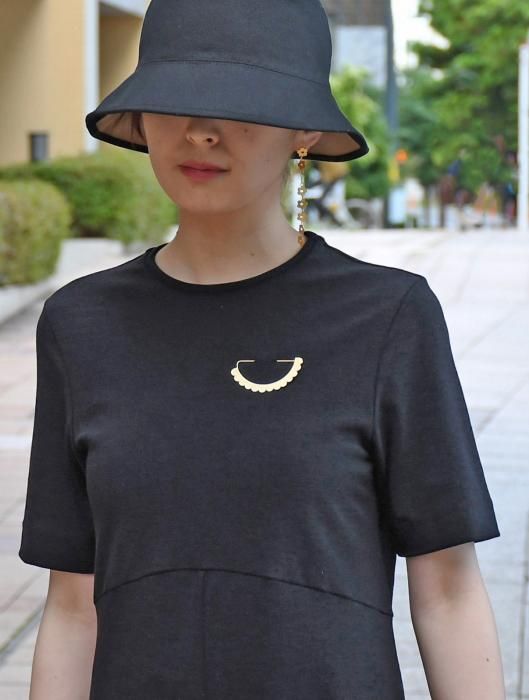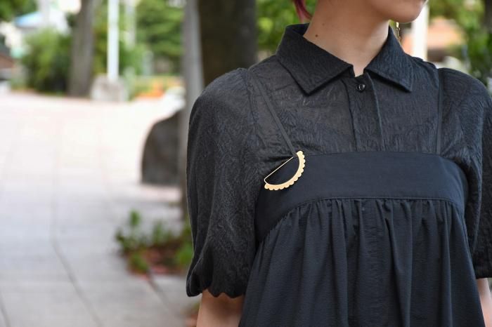 半円を薄い金属のスカラップで縁取ったブローチ。