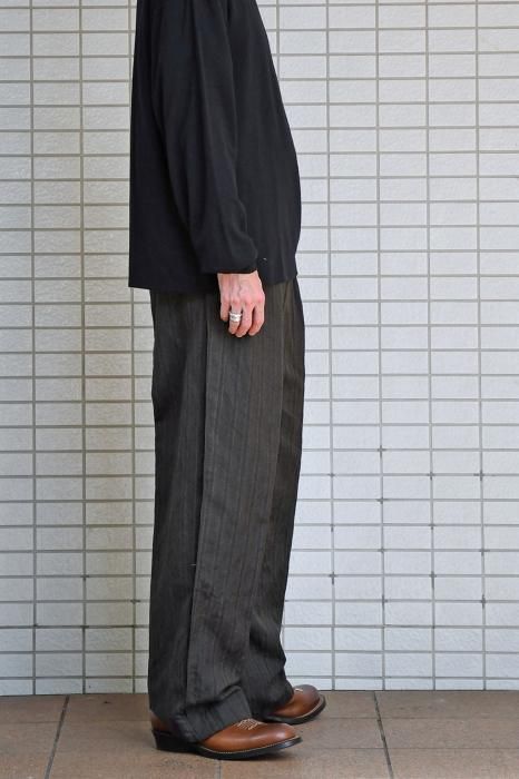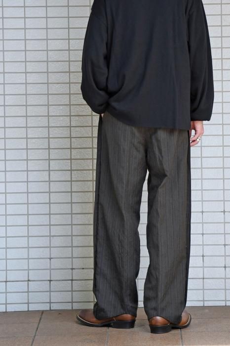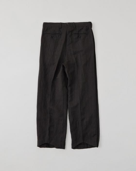 高原料のウール素材を使用したストライプのフライングVトラウザー。